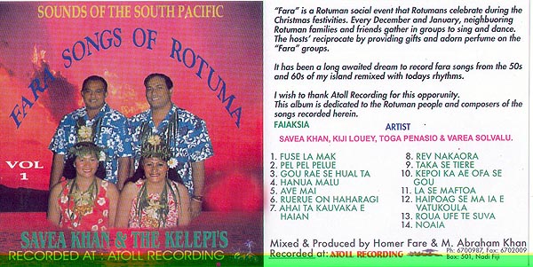 Atoll Recording, was established in December 2003, by Savea Khan to record and promote Rotuman music. Fara songs of Rotuma Vol.1 was recorded in late 2003 and has 14 songs. The artists on this CD are from the Kelepi clan of Rotuma: Aunty Savea, niece Kiji Louey, nephew Toga Penasio, and nephew Varea Solvalu. The music is directed by Homer Fare and the sound engineer is Aberaham Khan. This CD was produced to revive old Rotumen fara songs in today's rhythms. This album is on sale in Fiji at all S.P.R outlets. International customers can obtain a copy of the CD by sending a money order of Fj$40, which includes postage, with return address to: Atoll Recording Fax: 670-2009 Fara songs of Rotuma Vol.2 is being recorded and set to release in mid 2005. [12/04]
