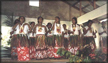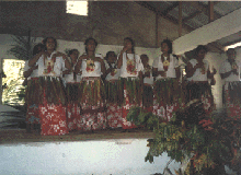 A group of women dancing in the traditional style. They are wearing ti leaf skirts over red sulus, and garlands (tefui) around their necks.