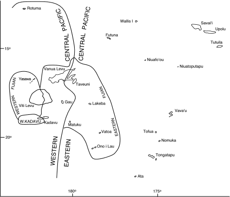The relationships may be confusing: Central-Pacific languages are spoken in Rotuma, Fiji, and Polynesia; they grew out of the Proto-Central-Pacific dialects. We speak of Fijian dialects only after Proto-Fijian developed such different varieties. There are Eastern Fijian dialects today like those in Northwestern Vanua Levu which belonged to the (Western- or) Central-Pacific dialect chain (as opposed to the Proto-Tokalau-Fijian one). The overlap of the dialect boundaries is shown on the following map. Dialect Boundaries in Fiji (Pawley 1979:39)