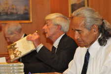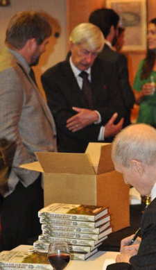South African pilot Juba Joubert (left) catches up with Peter Penfold, whilst Hamish Ross works on another stack of books to sign. |