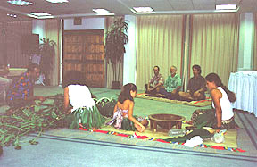 On 30 September, 2000, John participated in an 'awa (Hawaiian for kava) symposium at which issues associated with the growing of kava was discussed. The symposium opened with an Hawaiian chant, followed by a Rotuman kava ceremony, complete with fakpeje. The photo to the right shows Manrava (visiting from Fiji), who acted as mafua and chanted the fakpeje, Harieta who did the manu!, and Hannah and Kimberly, who served the kava.