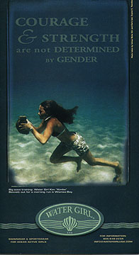 | This photo of Kimberly Bennett is in an advertisement for Water Girl swimwear and sportswear for ocean active girls. The caption underneath the photograph reads: Big wave training: Water Girl Kim "Kimbo" Bennett out for a morning run in Waimea Bay. The photo was taken while Kim was running under water with a large stone as a way of building her endurance while surfing. |