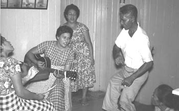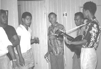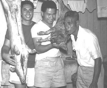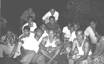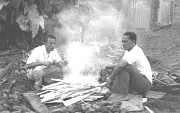 "It was a most interesting evening. There are no electric lights in Victor's house so the work was done in the light of several Coleman lanterns. The pigs had been killed and were strung up by the time I arrived and the chickens had been caught, but were still alive. The taro had already been put in the lovo. "The women plucked and dressed the chickens after the men killed them. After that the men didn't have much to do so they just sat around and drank beer and rum punch. Some of the men and women played cards. A few of the young men brought out their guitars and began playing. I drank rum punch and kava until about 2:30 a.m. although some of the others went on until about 4:30. I slept on a mat on the floor."