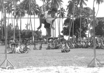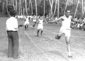 On 13 May the two big events were (1) the adult’s track and field meet, and (2) the awarding of prizes for all of the activities of the past two days, plus the awards for the baby show, which had been held the previous week. At the end of the day the foodstuffs that were on display were divided up and portions were given to the district chiefs , to the D.O., to the managers of the firms, to the Indian tailors, and to distinguished guests. In the adult track and field events, individuals competed for their districts. Both men and women competed. Most of them had trained seriously and had mastered such techniques as the western roll in the high jump. The coaches were the schoolteachers and others who had been to European schools where they had learned track and field techniques. Competition was keen, with people rooting for their friends and relatives, as well as for their home districts. The prizes were awarded by the District Officer and the total prize-giving ceremony took about two hours. Most of the prizes were in cash (400 pounds in all was alloted from the Rotuman Development Fund for this purpose). Cash prizes were given to the winners of the adult athletic events, but the winners of the children’s events only received candies, etc. Prizes from the adult games were from £1/5/0 for first pace, to 10 shillings for third place. Prizes were also given to the first three districts in the (1) baby show, (2) food competition, and (3) adult athletic games. These prizes consisted of cups and plaques. A prize was also given to the district with the most points in handicraft, and a cup went to the school that got the most points in the schoolchildren's competition.