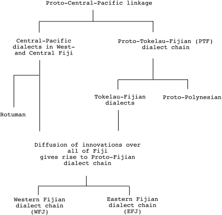 The present boundary between Western and Eastern Fiji has been pushed further to the West compared to the borderline between Tokalau-Fijian and central/western Central-Pacific dialects; it runs now through Vitilevu and Kadavu. So the Fijian dialects in northwest Vanualevu that are probably the closest relatives of Rotuman do not belong to the western half of the Fijian dialect chain any longer, but the eastern one. They were strongly influenced by the so-called East Viti Levu prestige area—the home of the Bauan dialect that was adopted as the standard variety of Fijian (SF). Although “the historical relationships between the Fijian dialects themselves and with regard to the Polynesian languages cannot adequately be shown in a family tree” (Pawley 1979:13), I try and present a synthesis of the claims of Geraghty (1983) and Pawley (1996:95) in the following diagram. If one accepts that Rotuman arose from the central/western half of the Central-Pacific dialect chain, then it is obvious that many splits and fusions have occurred since among the “stay-at-home” dialects in Fiji, obliterating or blurring many former similarities with Rotuman. Differentiation of the Central-Pacific Languages